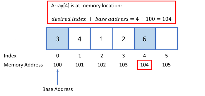 이는 각 메모리 위치의 순차적 특성 때문입니다. 예를 들어 인덱스 4에서 요소를 검색하고 싶다고 가정해 보겠습니다. 그런 다음 배열의 기본 주소(첫 번째 요소의 메모리 주소)를 사용하여 간단한 산술 연산으로 인덱스의 메모리 주소를 추론할 수 있습니다.