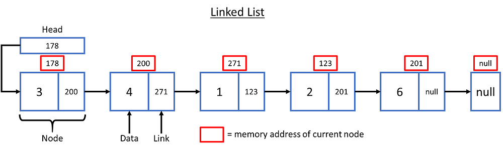 - 먼저 Head는 첫 번째 노드의 메모리 주소를 가리킵니다. 이 노드는 데이터 값과 다음 노드를 가리키는 포인터인 링크를 포함하고 있습니다.