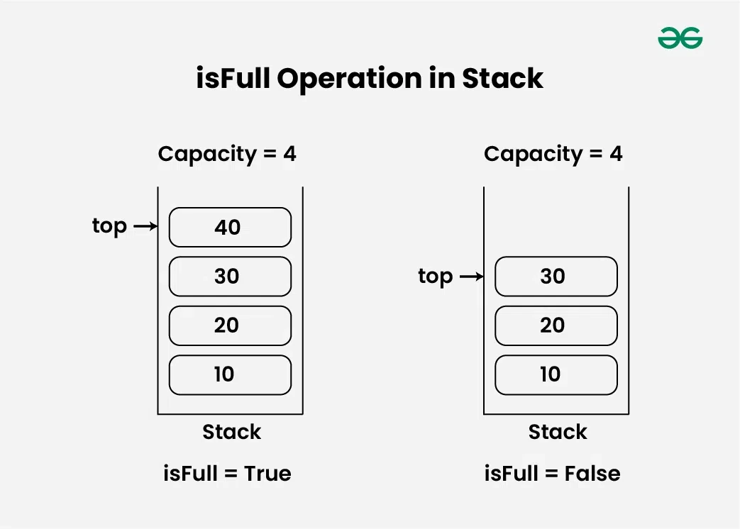 - isFull()은 스택이 가득 찼으면 true를 반환하고 그렇지 않으면 false를 반환합니다.