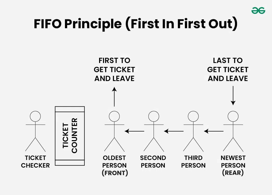 FIFO 원칙은 대기열에 추가된 첫 번째 요소가 가장 먼저 제거되거나 처리된다는 것을 나타냅니다. 따라서 대기열은 티켓을 구매하기 위해 기다리는 사람들의 줄과 같으며, 줄을 선 첫 번째 사람이 가장 먼저 서비스를 받는 사람입니다. (즉, 선착순).