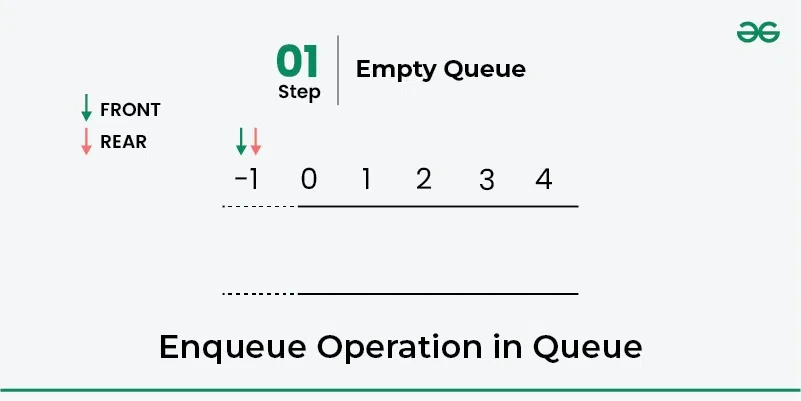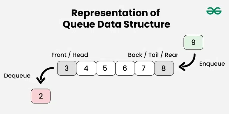 - 프런트: 큐에서 서비스될 준비가 된 항목의 위치, 즉 큐에서 제거될 첫 번째 항목을 큐의 프런트 라고 합니다. 큐의 헤드 라고도 합니다 .