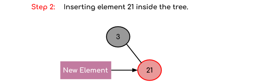 새로운 요소는 항상 빨간색으로 삽입되고, 21 > 3이므로 루트 노드의 오른쪽 서브 트리의 일부가 됩니다.