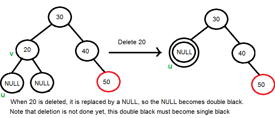 3.1) u를 더블 블랙으로 채색합니다. 이제 우리의 과제는 이 더블 블랙을 싱글 블랙으로 변환하는 것으로 축소됩니다. v가 잎이면 u가 NULL이고 NULL의 색상은 검은색으로 간주됩니다. 따라서 검은색 잎을 삭제하면 더블 블랙이 발생합니다.