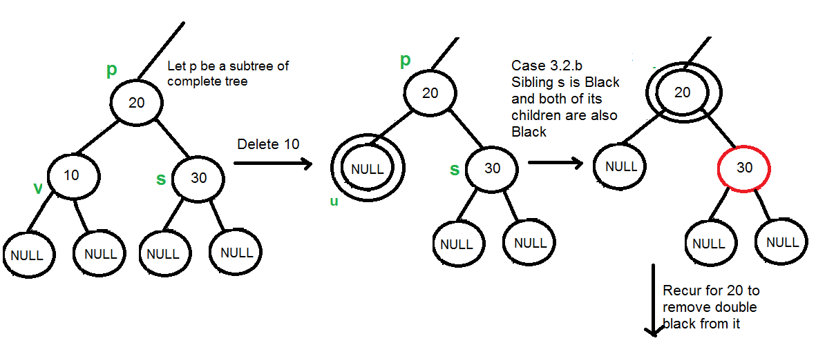 3.1) u를 더블 블랙으로 채색합니다. 이제 우리의 과제는 이 더블 블랙을 싱글 블랙으로 변환하는 것으로 축소됩니다. v가 잎이면 u가 NULL이고 NULL의 색상은 검은색으로 간주됩니다. 따라서 검은색 잎을 삭제하면 더블 블랙이 발생합니다.