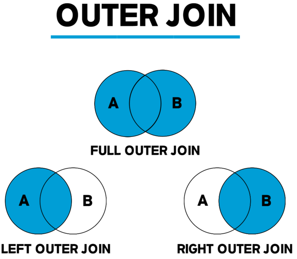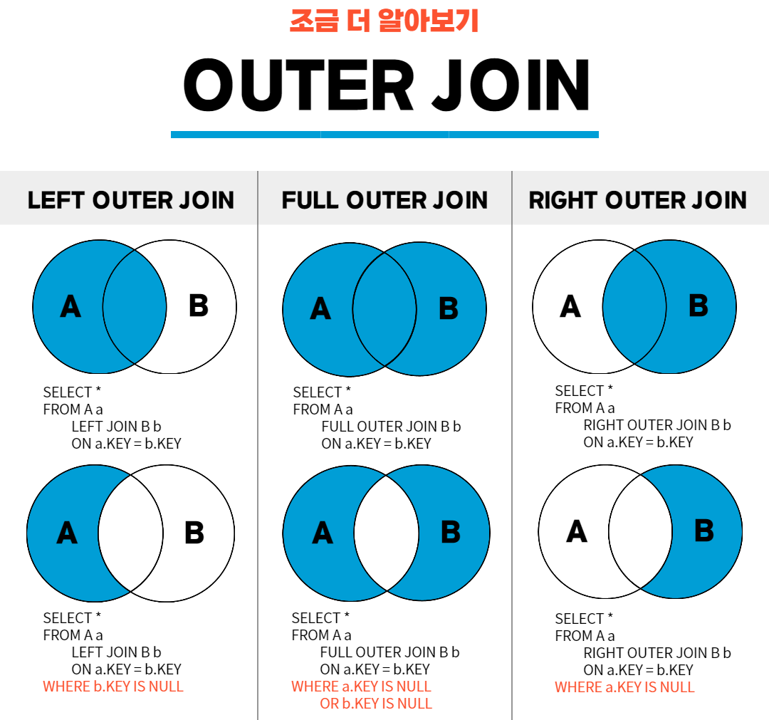 - FULL OUTER JOIN: 왼쪽 외부 조인과 오른쪽 외부 조인이 합쳐진 것