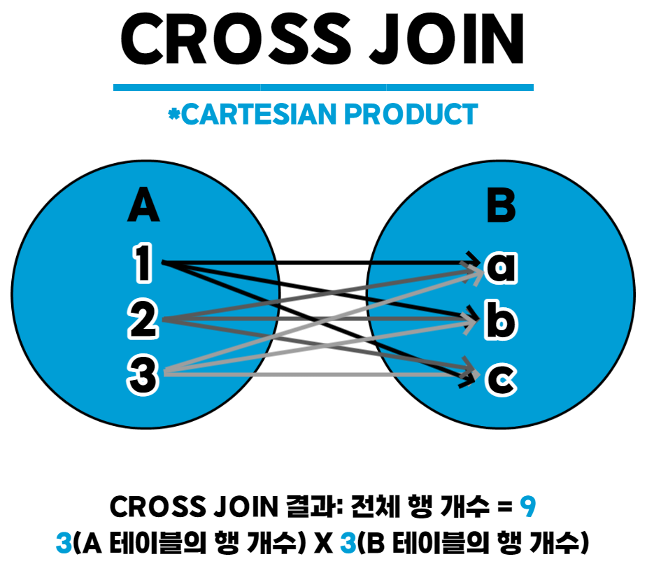 두 테이블의 모든 행을 조합하여 곱집합(Cartesian Product)을 생성합니다.