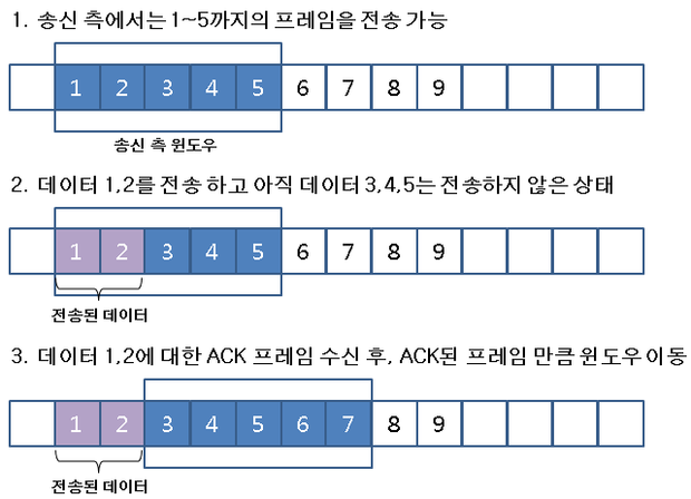 송신자는 수신자의 수용 가능한 데이터 크기(윈도우 크기)를 기반으로, 여러 데이터 프레임을 연속적으로 전송할 수 있습니다. 수신자가 ACK를 보내면, 송신자는 새로운 데이터 프레임을 추가로 전송합니다.