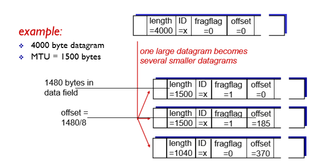 - 헤더에는 조각 정보를 담은 Fragment Offset과 More Fragments(MF) 비트가 포함됩니다.